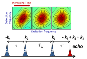 2D IR spectroscopy can rigorously correlate the probe frequencies and directly follow their evolution in time. The time-dependent change in lineshapes reflect the dynamics of the frequencies of an absorption band, which in turn reflect the fluctuations of the environment surrounding the probe (i.e. the interconversion among conformational substates).